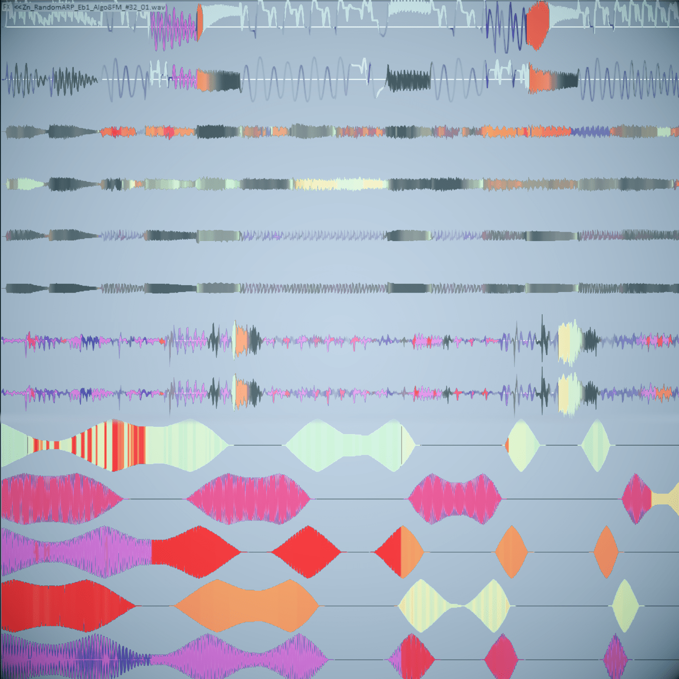 Generative algorithms using a Turing machine, clock dividers, modulators, sequencers and oscillators have been developed in Reaktor to control the synthesis engine (FM, additive and granular). He uses approaches of computer-assisted composition but applied to acousmatic music.